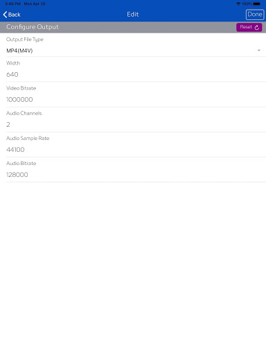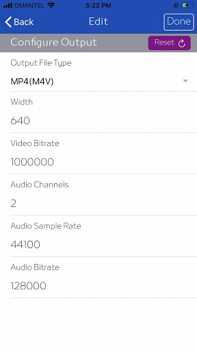 The netPicker app provides options to edit video file properties such as width, type, bitrate, audio channels, sample rate etc.