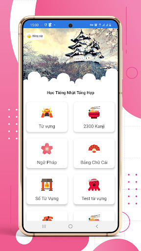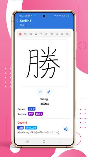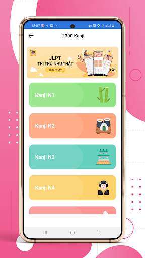 12. Học 1945 hán tự (Kanji) được chia theo level từ N1 - N5 , Kanji được thiết kế đẹp mắt được chia thành nhiều bài học giúp học tập dễ dàng.
