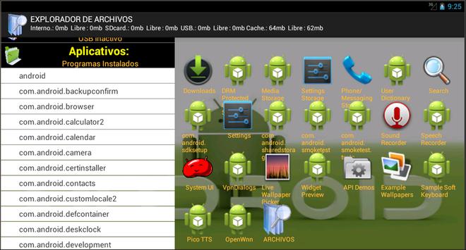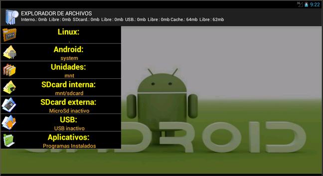 Este aplicativo le permitira conocer como estan estructurados los directorios internos como carpetas y archivos de su dispositivo, su organización es semejante a una estructura de linux por lo que no debe compararse con una PC.