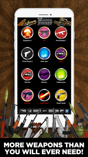 This weapon sounds application, you can find various weapon sounds in high quality and you can use them as ringtone, contact ringtone, SMS notification and alarm ringtone. If you are a weapon fan you will love this awesome gun app. Sounds of silenced firearms, rockets, shotguns, and snipers, machine guns and more, await you in this amazing collection of sound effects. Download Weapon and Gun Sounds and have some gun ringtones or real gunshot sounds on your phone. Get this app for free and hear how real gunshot sounds. This soundboard app is perfect choice if you are looking for some shooting pistol or firearm sound effects and ringtones. Download Weapon and Gun Sounds now for free and get the best collection of weapon sounds and ringtones for free.