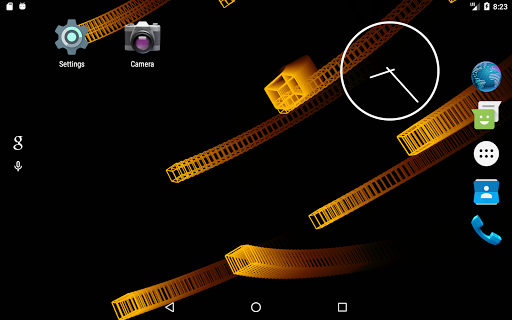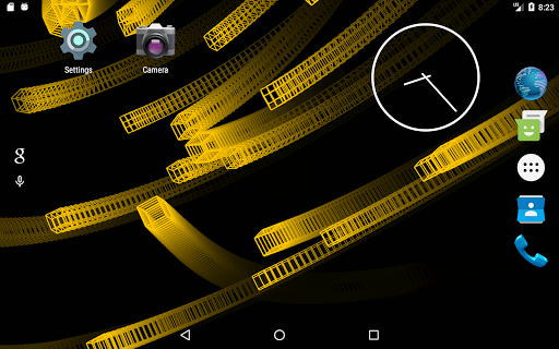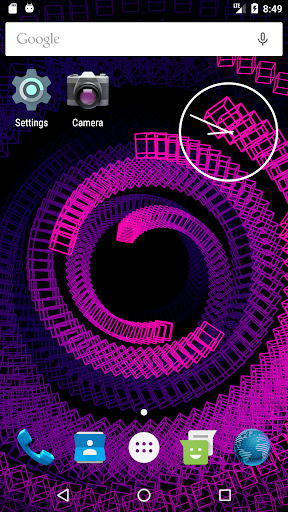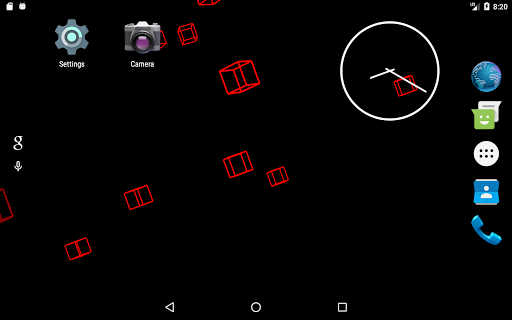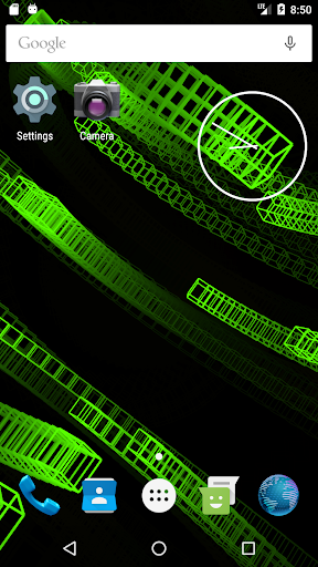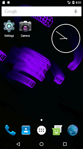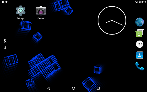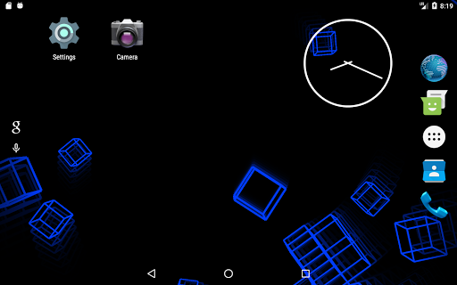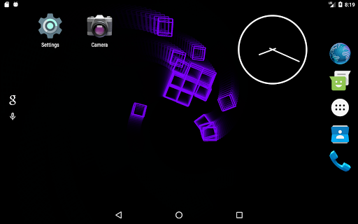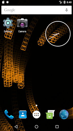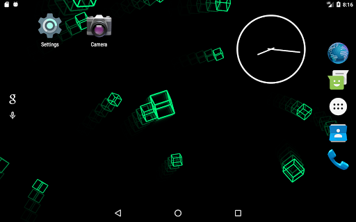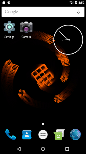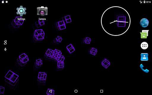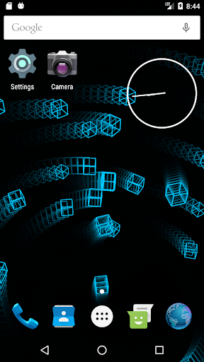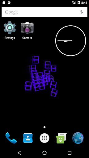 This live wallpaper is centered around recursive behavior while still presenting unique and beautiful patterns. Utilizing variable colors, adjustable trail effects, and random orientations and speeds, this repetitive sequence always creates new and interesting images. As the wireframe cubes move and rotate in the void behind your screen, they assemble themselves into a new cube which, in turn, is joined by others as the process repeats. Dragging along the leftmost edge of the screen will respectively adjust the trail length while three consecutive taps anywhere will pause/continue the color cycle. This wallpaper is enjoyable to watch and will leave your apps and icons clearly displayed so as not to affect productivity or make a mess of your screen.
