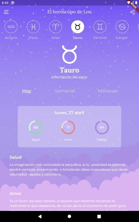 Accede a tu horóscopo desde tu dispositivo. Esta apliacación proporciona horóscopo diario, semanal y mensual. Disponible gratuitamente.