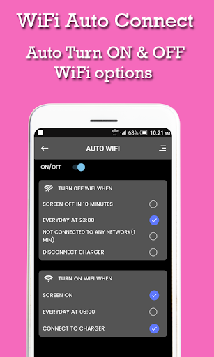 - With Wi-Fi Auto Connect app Device Screen is On the WiFi gets Connected, When the device is getting charged the WiFi gets Connected and when the user launch the WiFi required apps then also the WiFi get connected Automatically. When the Device get out of the WIFi Range and the WiFi is not required by the apps then WiFi Automatically get turned Off.