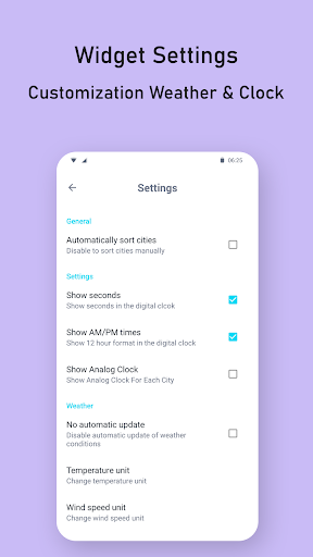 - Settings for Time and Weather (View analog clock or digital clock, view pm-am or not).