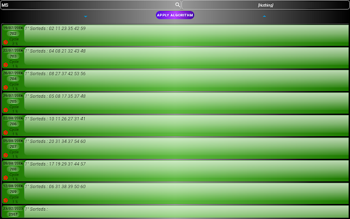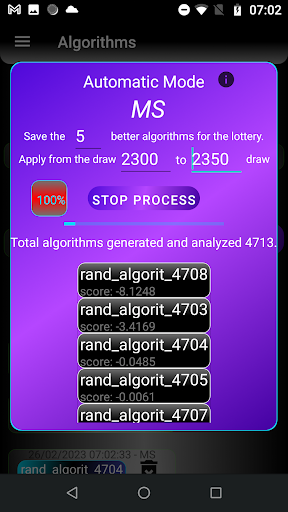 Loto Hacker analyzes historical lottery results to generate algorithms that simulate betting patterns and generate guesses for the next draw based on the patterns. It can work endlessly generating and analyzing algorithms when you leave your phone in idle mode, it can generate algorithms one at a time randomly or completely manually according to your desired criteria. Excellent for doing studies and game strategies for lotteries.