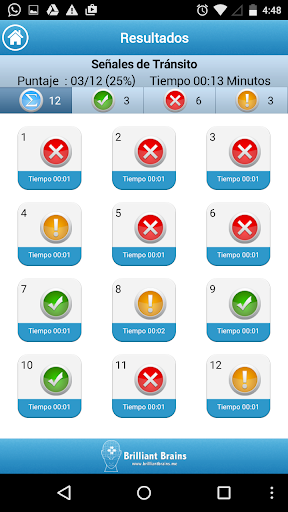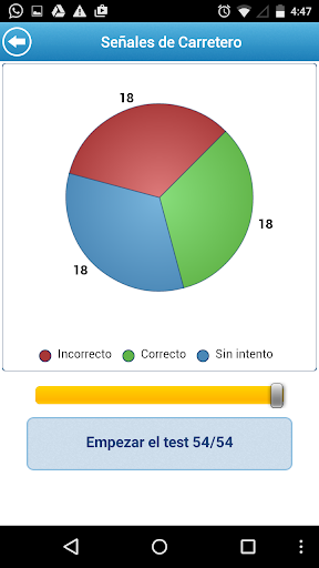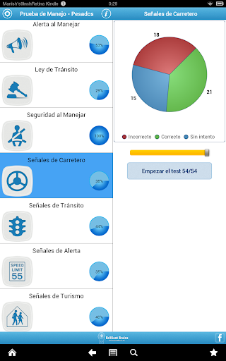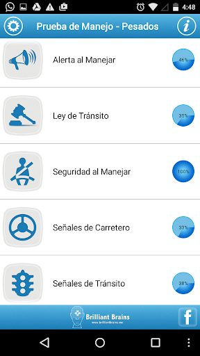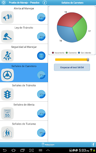 Medidor de Avance : La Aplicación mantiene registrado tu avance desde el momento que empezó el test. Con un atractivo diseño, puedes revisar la información en forma de pastel y conocer tus fortalezas y debilidades en todo momento.