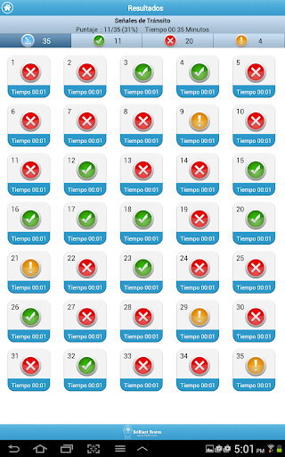 Al completar cada prueba, se presenta el resúmen de los aciertos, errores y preguntas que se dejaron sin contestar.
