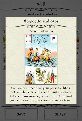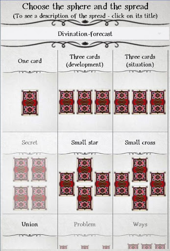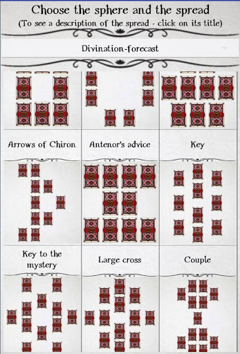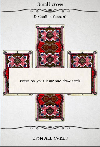 The method of divination in our application is absolutely identical to guessing in a real salon. The process of divination and the outcome depends entirely on you and no one else. The selection of cards is according to the rules of the layout of Maria Lenorman. Thanks to this, the result of the divination turns out to be very accurate.