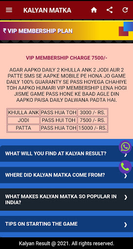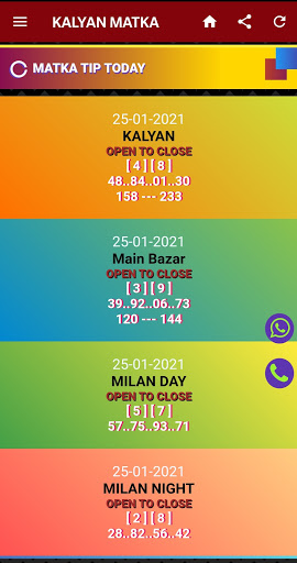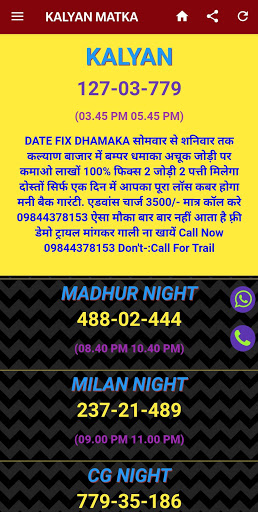 The new Satta Matka Kalyan app has all the games from the matka office like Milan Day/Night, Time Bazar, and Rajdhani Day/Night, Main Mumbai, Main Bazar, Kalyan Result and Kalyan Chart. Its first genuine satta matka app in the matka market. We provide free kalyan fix game and other markerts as well like mention above all market names. We have designed this app based on most playing matka customer.