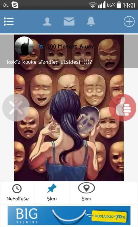 * Dalinkis įrašais su žmonėmis netoliese, įrašais dalijamasi 5km spinduliu, kiekvienas narys gali pratęsti įrašo rodymą dar 5 kilometrus,