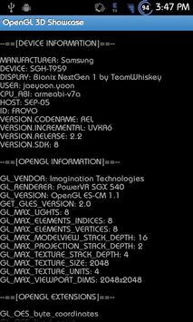 Includes a report specifying detailed OpenGL information, available display configurations, list of supported OpenGL extensions, and the ability to save all of that information to SD card. This application also comes with the complete source code, available via a long-press on any demo.
