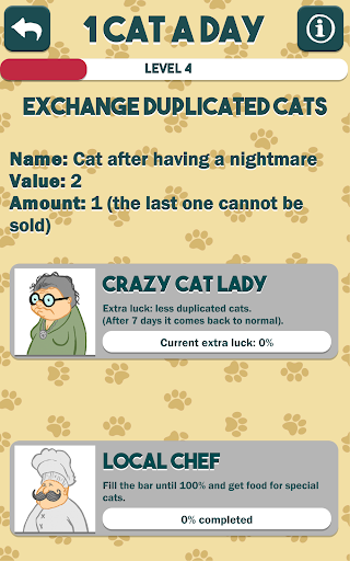If you get a duplicated cat, you can exchange it for some advantages: better luck to make sure you get non duplicated cats next time, or a special food to reach legendary / unique cats.