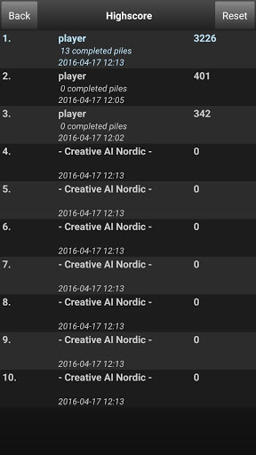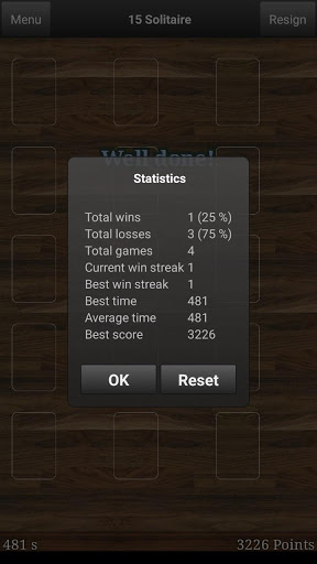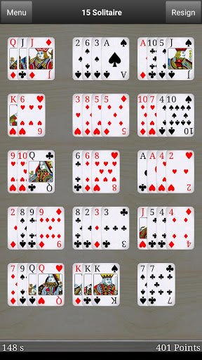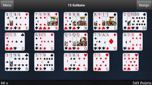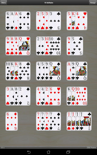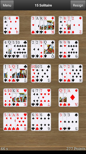 15 solitaire (or 15 puzzle solitaire) is a card solitary game where your goal is to arrange the cards according to value so that all cards with the same values ends up in the same pile. It may sound simple, but it is fun and quite tricky to solve. In the game you can select your preferred card table and card backside to get a more personal experience. You have access to statistics and highscore. In this card solitaire you need to plan ahead before making your moves. It is a nice challenge, try the 15 solitaire now.
