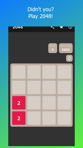 Swipe (Up, Down, Left, Right) to move the tiles. When two with the same number touch, they merge into one. After every swipe, a new tile will appear in a random empty spot on the board. Slide the cells to merge them, 2 2=4, 4 4=8, 8 8=16, 16 16=32 ... 64 ... 128 .. 256 .. 512 .. 1024 ..., when 2048 tile is created, you win!
