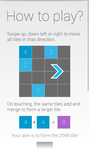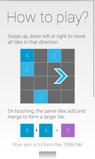 Swipe (Up, Down, Left, Right) to move the tiles. When two tiles with the same number touch, they merge into one. When 2048 tile is created, the player wins!