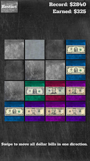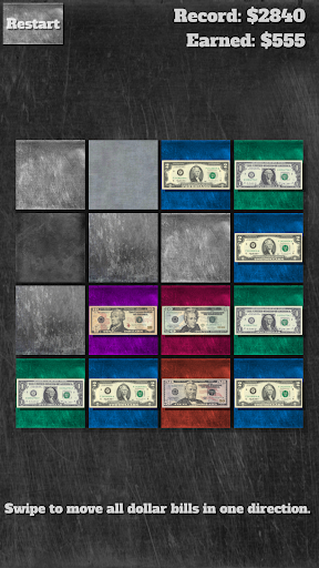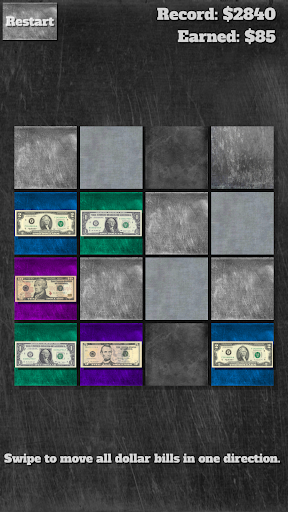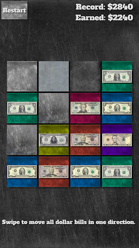 Swipe in any of the four directions (up, down, left, right) to move all dollar bills across the field. Bills of the same denomination merge to form a bill of a higher denomination. You start with 1- and 2-dollar notes. Grow past the famous 100-dollar note to the lesser known historical 500-dollar, 1k, 5k, 10k, 20k, and the whopping 100,000 dollar note! Keep playing to find out how those notes actually looked.