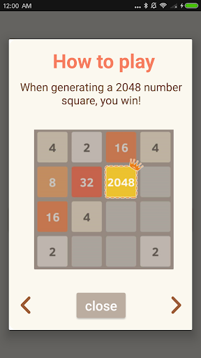 Slide the screen (up, down, left, and right) to move the number square. During the move, two adjacent squares of the same number are combined and combined into a new square. The number of the merged square is the sum of the two original numbers. 2 2=4, 4 4=8, 8 8=16, 16 16=32... When 2048 or 4096 or 8192 is formed, you will win!