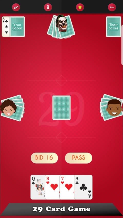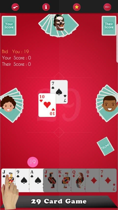 Twenty Nine Card Game "29" or Twenty eight is a card game for four players, the nine and the jack are the highest cards in every suit, followed by ten and ace. This Card game is very popular around the world but specialy in India.
