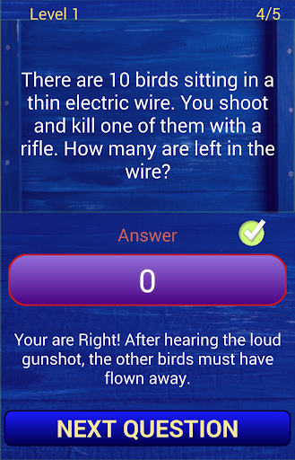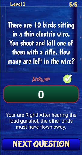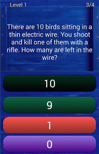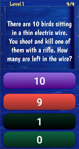 This game contains 300 awesome brain riddles & teasers that test your intelligence and ability to think beyond ordinary. It contains multiple choice questions with tricky choices. Explanations are available to give you a hint on why the answers are such. It is sure that you will enjoy this app as you challenge the way you think. The trick here is to choose the simplest answers and avoid choices that are