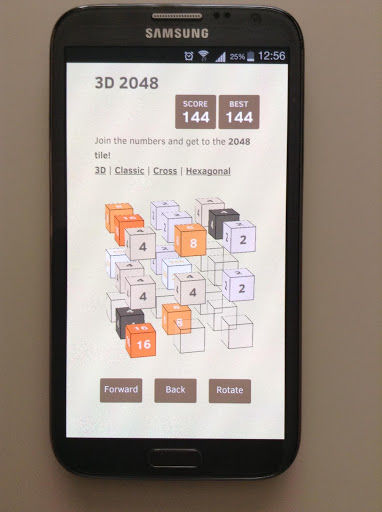 Use your finger to move the tiles, Forward or Back to move ahead and back, Rotate button to rotate. When two tiles with the same number touch, they merge into one!.