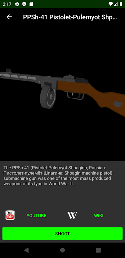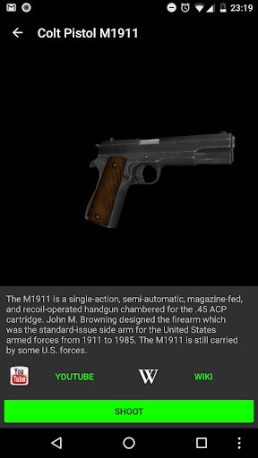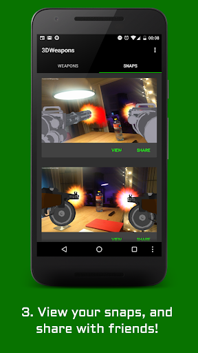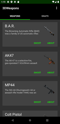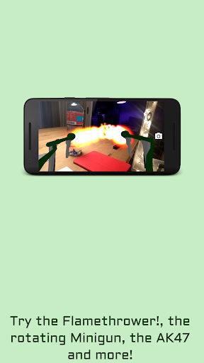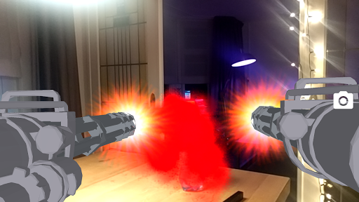Shoot with 3D weapons in Augmented Reality! Choose from multiple guns. Rotate your weapons in 3D and shoot trough your camera! Make a picture of the gun aimed at somebody and share it with the world!