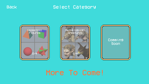 Enjoy solving incredible puzzles in 3D! Features: -8 funny 3D puzzles -2 Completely different categories (Geometry Objects and Mythological Creatures) -More content to come!