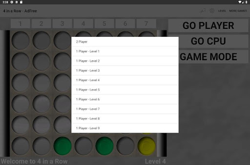 Play 4 in a Row against a friend (2 players) or the challenging CPU player. Whoever can connect four pieces in a row first on the board wins.