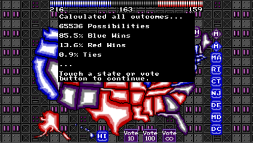 Touch states on the map to set them to red, blue, or toss up. Then touch a vote button to see the results. The first vote buttons display 10 or 100 outcomes for the current state of the map. The final vote button calculates all possible outcomes for the current state of the map.