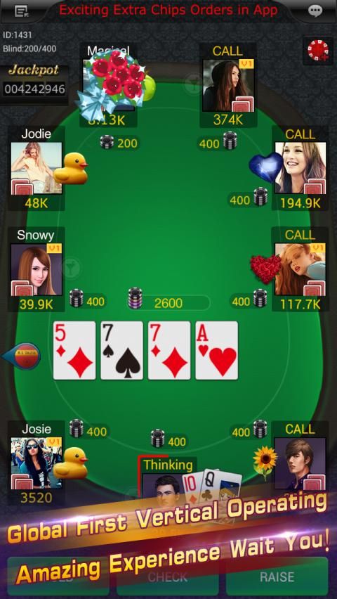 The game has concise interface and support in vertical mode. 9-seats tables support real players play together. Use Mr. Slayers emoticons and interactive action will easy to make friends. Good social functions and personalized settings are providing a good chance to show your personality in game. It's doesn't matter if you don't know how to play the game. The Guide for new player will teach you the rules and operation method of the game. It's easy to learn. You can select a suitable table in different blinds table list.