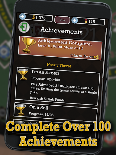Continue to hone your skills with Advanced 21 Blackjack through table advancement, starting as “The Rookie” and earning your way to the “The Whale” table. Earn club points by completing achievements and to unlock new graphics, including: