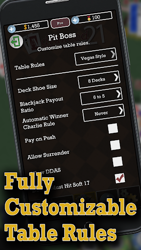 - Set the gameplay rules for: auto-rebet, auto-stand, showing suggestions for the basic blackjack strategy, auto declining insurance, show or skip animations, and much more!