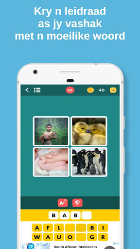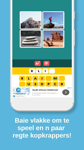In this game, you are given four photos that represent one word. If you get stuck then you can reveal some letters to give you a clue. It is one of the most fun Afrikaans word games. It is also rather enjoyable to do the Afrikaans word search. The game can sometimes be a really tough Afrikaans word puzzle.