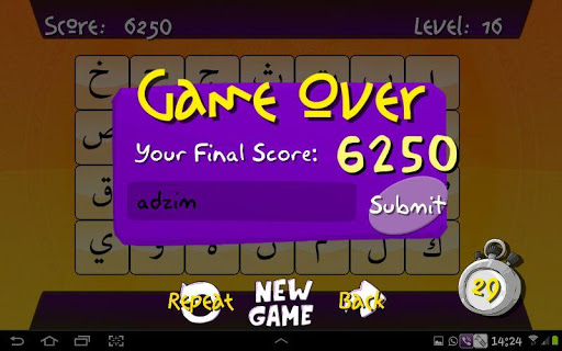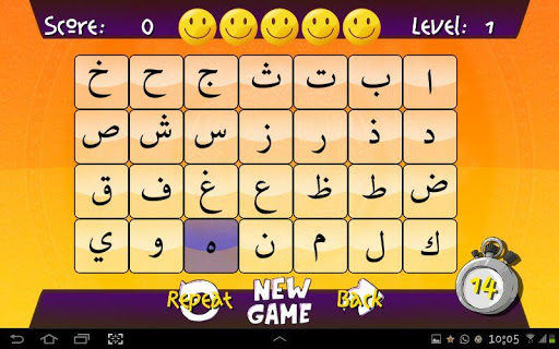 The word to catch is represented by the sound of the Arabic alphabet and giving with the splash letters. The player needs to repeat the sequence with the same orders to get points of mark. If the player guessing a letter that does not occur in the sequence, the smiley face will decrease one by one until there is no smiley face which means the users has exceed game over.