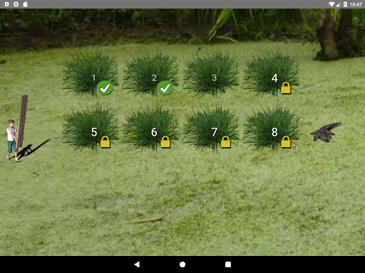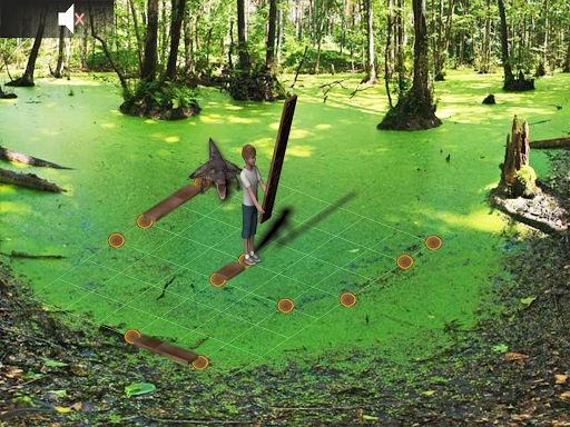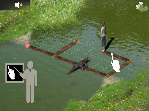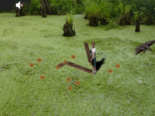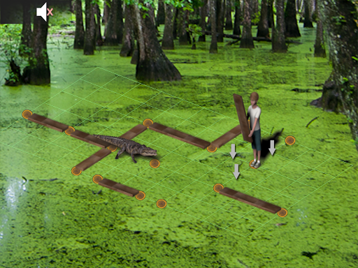 Max needs to cross the swamp. He is only allowed to walk on wooden planks, which he can freely move between some tree stumps. Beside the puzzle that Max needs to solve, he also has to avoid the hungry Alligator.