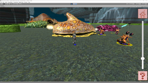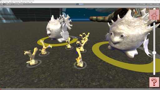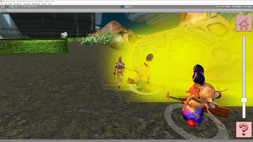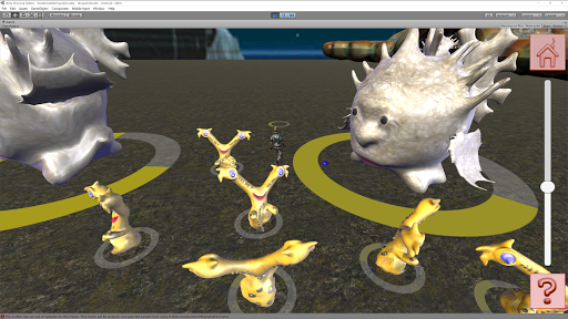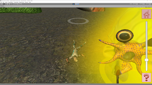 This is a kind of a stealth game.You are represented in this 3D world as an avatar finding yourself in the cross section of the gut with mouth somewhere above you (not visible). So the food transport occurs from top to bottom and you soon encounter e.g. a cucumber that lands on your level and small bears (=healthy food particles) start to march out of it to the gut wall having for their goal the factory which denotes the metabolism and biosynthesis. There they enable the creation of the elephants - macrophages - which jump towards you and circle around you in order to protect you. You have also another way of getting your protection. If you bump into the good food that has descended, bunnies come out of it. They stand for antibodies killing the evil antigens just like the macrophages also kill the antigens. However when you bump into bad food the antigens (small white combatants) emerge and start to shoot around. The antigens come also out of the harmful food or bacteria you swallowed - denoted here by the battle bus. There is also a capsule landing and out of it come the strange looking antibiotics with three legs. They also stand on your side, but beware of the toxins - robots - which after seeing you they run after you and shoot deadly shots at you.