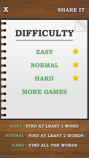 * Easy - find at least 1 anagram to be able to go to the next round. After you find at least one anagram you can continue to the next round or continue in playing the current round to gain more points!