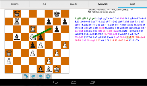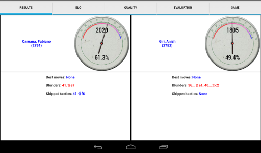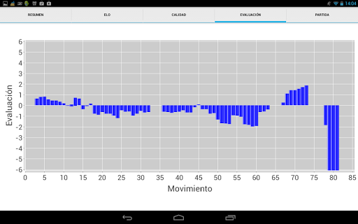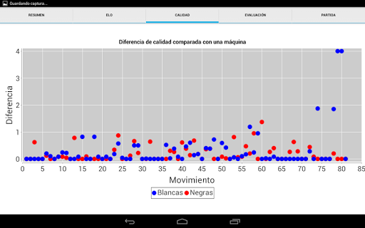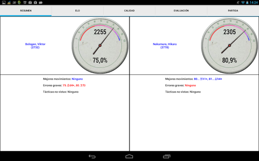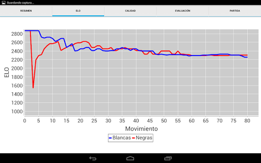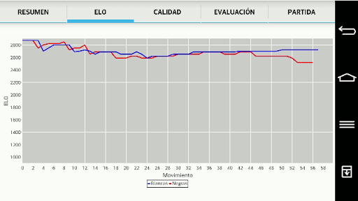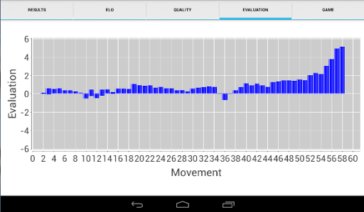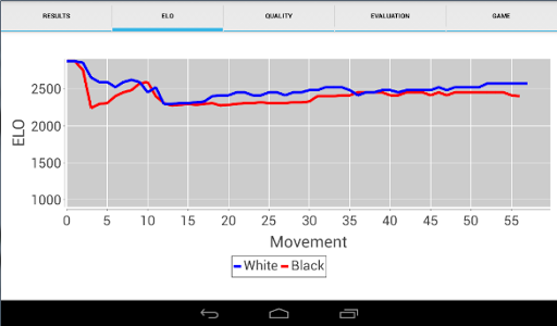 Once the analysis phase is over (or even in half-analyzed games), the application shows a briefing of the calculated results, highlighting best moves, blunders and skipped tactics. It also shows ELO and quality graphs in every movement of the game, taking into account that openings are not included in the calculus. By default, movements pertaining to completely lost or win positions are not included in the analysis, because players tend to do safe moves instead of accurate ones in those phases of the game. The analyzed games can be reviewed at any time without the need of a further analysis.