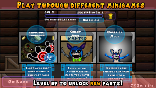Animatronic Jumpscare Factory isn't your typical character creator. Aside from allowing you to make thousands of combinations of characters, you can even view the animated jumpscare of your creation and record your own custom screams. At the Minigame Lab, you can blast away enemies to survive the five hours of the night in Shootout Showdown, or hunt down Wanted animatronics in Quest Mode to unlock even more parts! The possibilities are endless! Get ready to create your own nightmares.