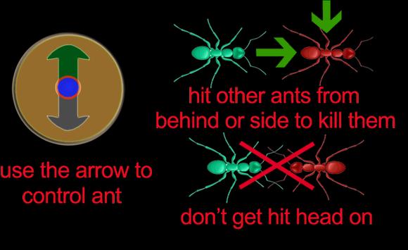 The only challenge you have to face is defeating all the ants which really smart, strong and deadly skillful opponents in limited arena. Use the arrow to control your hero (green ant), hit other ants from behind or side to kill them, don't get hit head on.