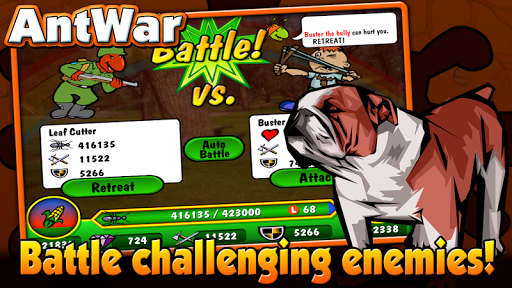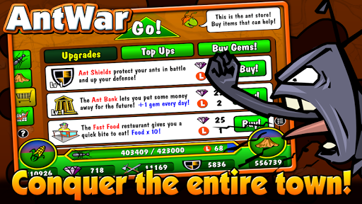 Emerge from the ant hill with a handful of ants and a dream... to conquer the world. Train your ants with new skills, manage their daily work load, and travel across the town in search of new land. Sharpen your pinchers and be ready for a fight because everyone from beetles and slugs, to the town police and the army will try to stop you in Ant War.