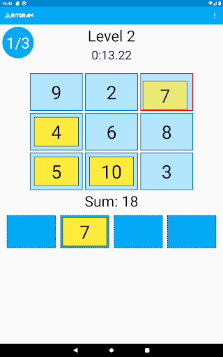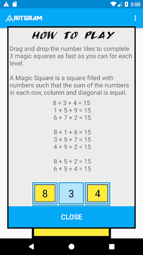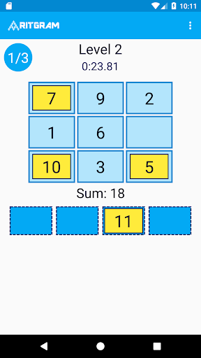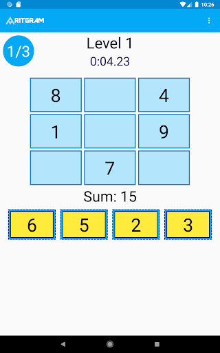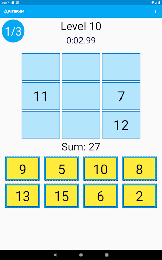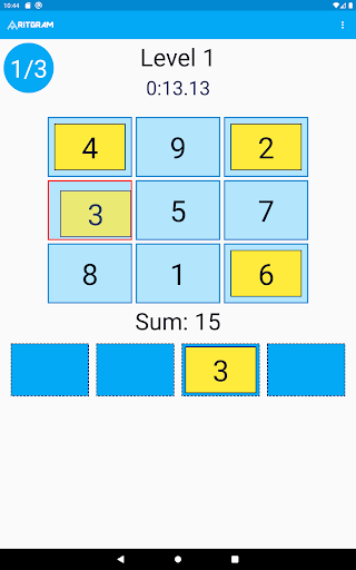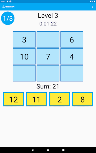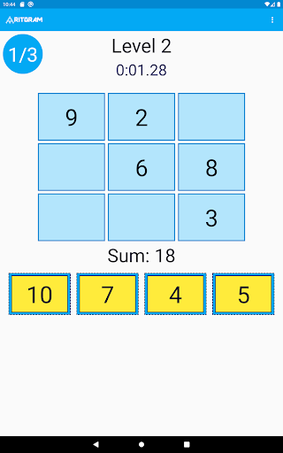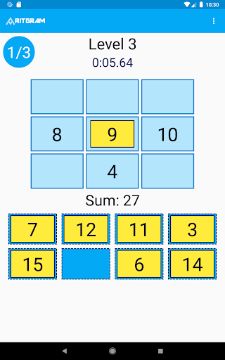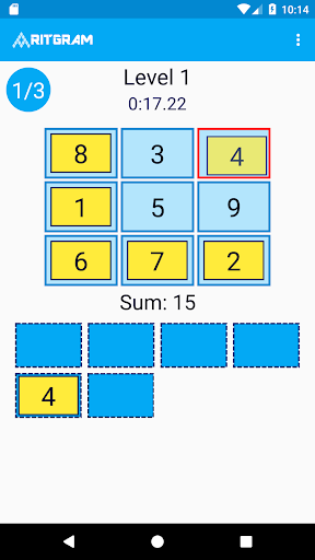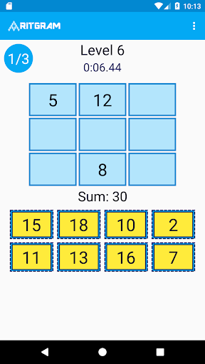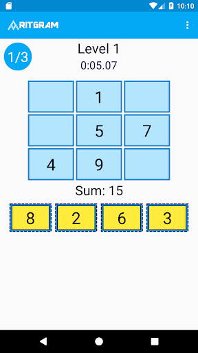 Each square has to be filled with numbers such that the sum of the numbers in each row, column, and diagonal is the same. Drag and drop the number tiles to complete three magic squares as fast as you can for each level.