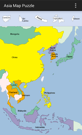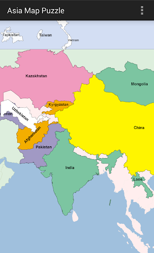 This app is a puzzle of Asia, where each piece is the shape of a country. Drag and lock the pieces into place. Your progress is saved as you lock pieces. If you exit the app and restart, your locked pieces are restored.