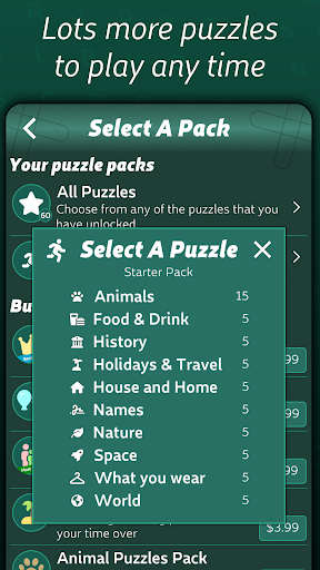 There are 60 built-in and unlocked puzzles with a range of categories, so you can play offline and have fun right away. With over 20 categories, and more than 100 different word lists, there's lots of variety as you play through the free puzzles each day - and perhaps learn something new too.