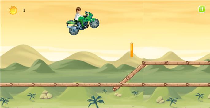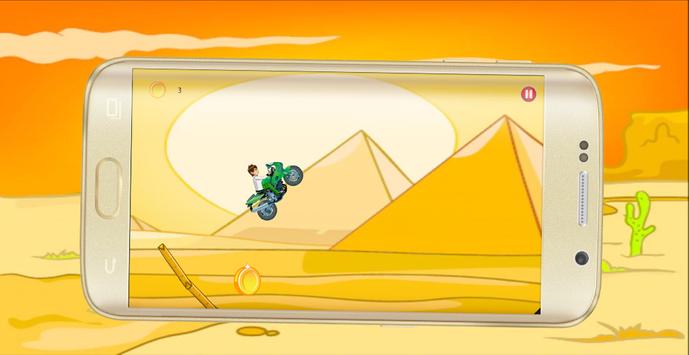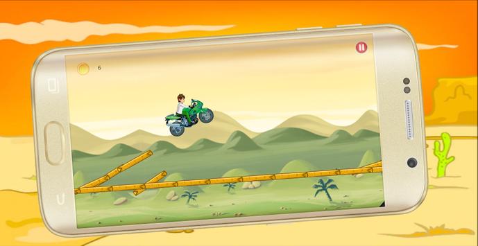 Ben-10 Racing Moto Cross is a fast bike racing game. You never dare drive so fast in the real world! Control your bike Cross with incredible fast speed during traffic rush time! Also enjoy beautiful view during the journey - desert, city, bridge and forest!