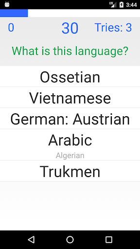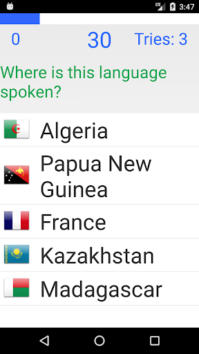 Players choose to be quizzed on languages spoken in a selected country, country the language is spoken in, favorite languages, or the most spoken languages. The game plays one of the languages. Users attempt to guess which language they hear from a list of five language names. In the Countries by Language mode guess the country the language is spoken in. After three incorrect guesses the correct answer is revealed. More points are awarded depending on the speed the player responds. After ten rounds the game finishes. The top ten highest scores are recorded.