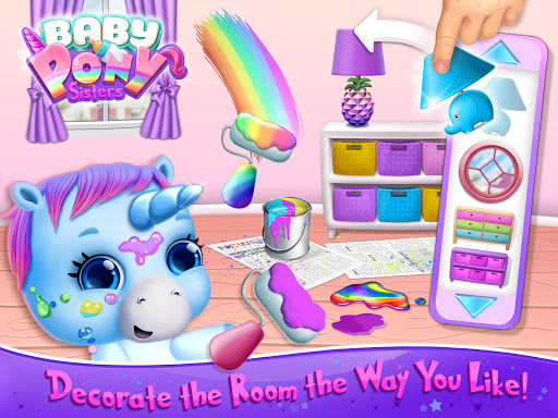 Decorate the pony sisters’ room the way you like! Design the cutest wallpaper! Add patterns, glitter and rainbows! Choose the prettiest furniture and room accessories! Make the baby room look like a fantasy rainbow world! The pony sisters will love it!