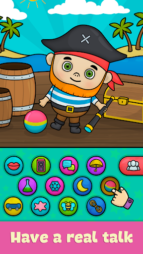 Develop communication skills talking to 6 cute characters: Cat, Cow, Frog, Monkey, Fairy and Pirate.