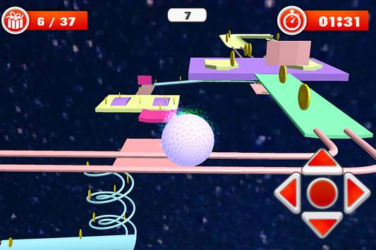 Drag a ball by four direction arrow button on screen and touch. Pick the gift by ball collision. Collect all gift and reach at destination. Run slow and fast on narrow path, don't fall your ball. Really thrilling environment, there advantural parts are slops and heights.