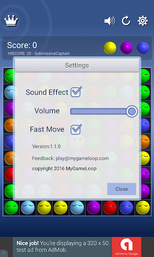 The game's objective is to remove balls by forming lines (horizontal, vertical or diagonal) of at least five balls of the same color. Balls on a line are removed and points are given.