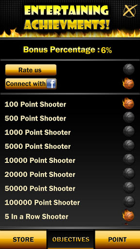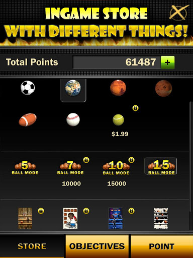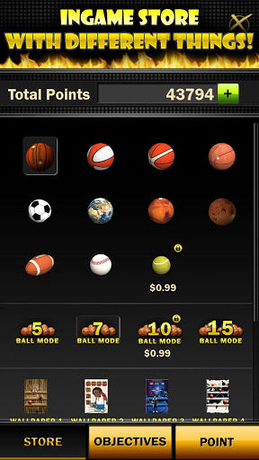 You have 4 levels with different modes and 30 seconds per each. Try to get as many points as you can, make accurate toss in a row and get additional seconds. Collect points and buy different balls, game themes and wallpapers for your device.